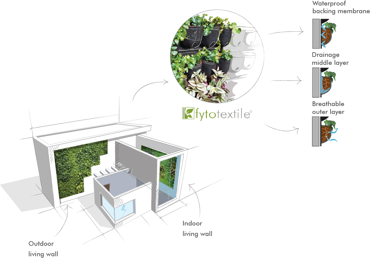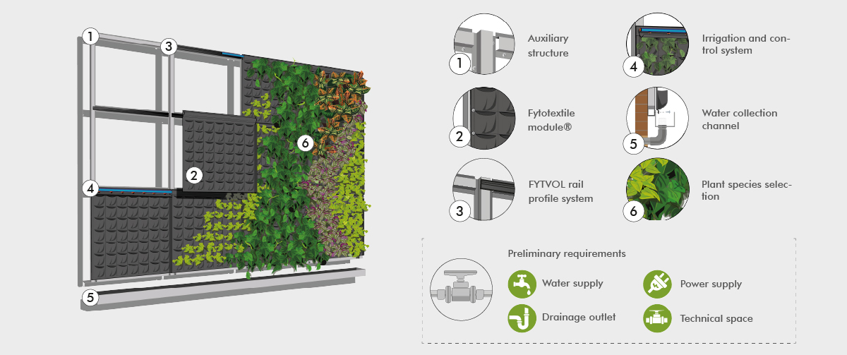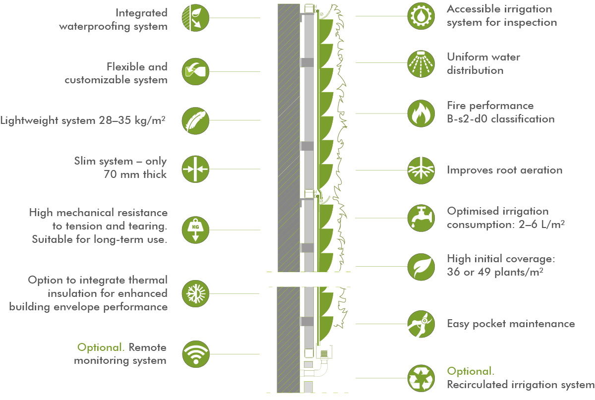The Fytotextile® system provides numerous technical features that make it an advanced construction solution for the installation of state-of-the-art landscaped facades. In addition to an excellent mechanical behavior, its high porosity maximizes the gas exchange of the buried part of the plant, which is responsible for air biofiltration and fixation of VOCs, so harmful to health.